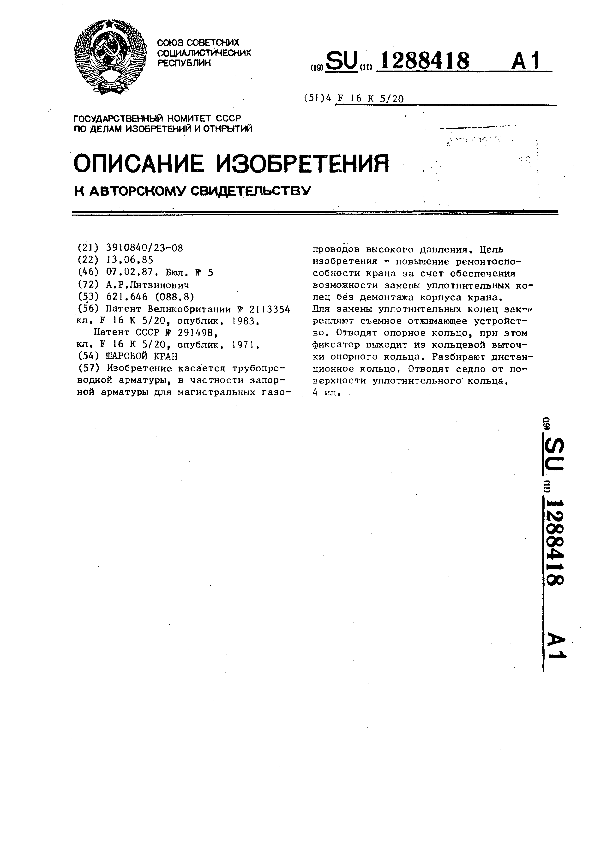 Шаровой кран / Литвинович А. Р. // Описания изобретений (ретрофонд) / Комитет по патентам и товарным знакам России. – М., 2003. – 1987, № 1. — (Патенты России). — Загл. с титул. экрана. — Поисковая система: MIMOSA GTI. — Систем. требования: Acrobat Reader. — Режим доступа: ftp://smolensklib.ru/bd/patent_ru/pt1288418.pdf. — <URL:ftp://smolensklib.ru/bd/patent_ru/pt1288418.pdf>.