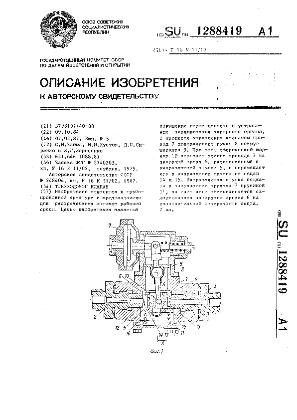 Трехходовой клапан / Хаймс С. М., Кустов М. И., Сиренко Д. П., Борисенко В. Г. // Описания изобретений (ретрофонд) / Комитет по патентам и товарным знакам России. – М., 2003. – 1987, № 1. — (Патенты России). — Загл. с титул. экрана. — Поисковая система: MIMOSA GTI. — Систем. требования: Acrobat Reader. — Режим доступа: ftp://smolensklib.ru/bd/patent_ru/pt1288419.pdf. — <URL:ftp://smolensklib.ru/bd/patent_ru/pt1288419.pdf>.