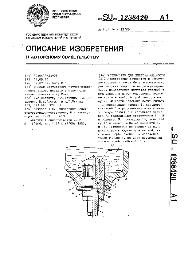 Устройство для выпуска жидкости / Федорук В. А., Бакшин А. Ф., Латайчук Г. К. [и др.]; заявитель: Филиал Ростовского научно-исследовательского института технологии машиностроения в г. Ровно // Описания изобретений (ретрофонд) / Комитет по патентам и товарным знакам России. – М., 2003. – 1987, № 1. — (Патенты России). — Загл. с титул. экрана. — Поисковая система: MIMOSA GTI. — Систем. требования: Acrobat Reader. — Режим доступа: ftp://smolensklib.ru/bd/patent_ru/pt1288420.pdf. — <URL:ftp://smolensklib.ru/bd/patent_ru/pt1288420.pdf>.