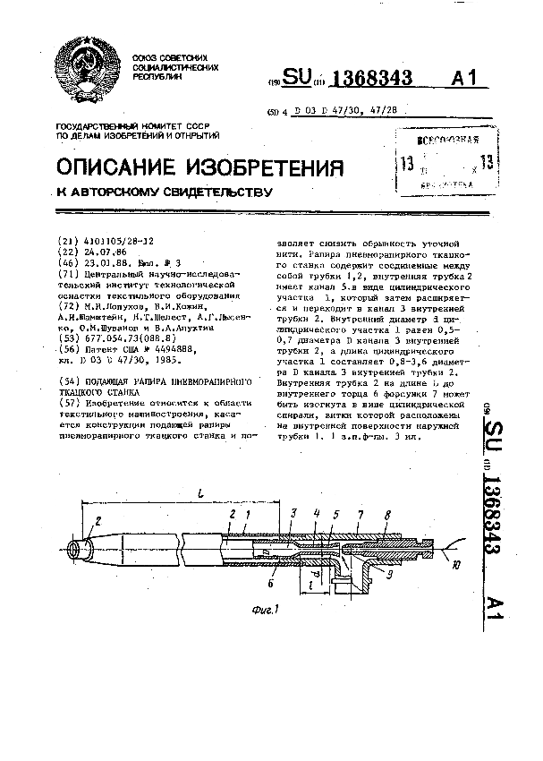 Подающая рапира пневморапирного ткацкого станка / Лопухов М. И., Кожин В. И., Шамштейн А. И. [и др.]; заявитель: Центральный научно-исследовательский институт технологической оснастки текстильного оборудования // Описания изобретений (ретрофонд) / Комитет по патентам и товарным знакам России. — М., 1994-____. — (Патенты России). – 1988, № 1. — Загл. с титул. экрана. — Поисковая система: ИПС MIMOSA GTI. — Систем. требования: Acrobat Reader. — Режим доступа: ftp://smolensklib.ru/bd/patent_ru/pt1368343.pdf. — <URL:ftp://smolensklib.ru/bd/patent_ru/pt1368343.pdf>.