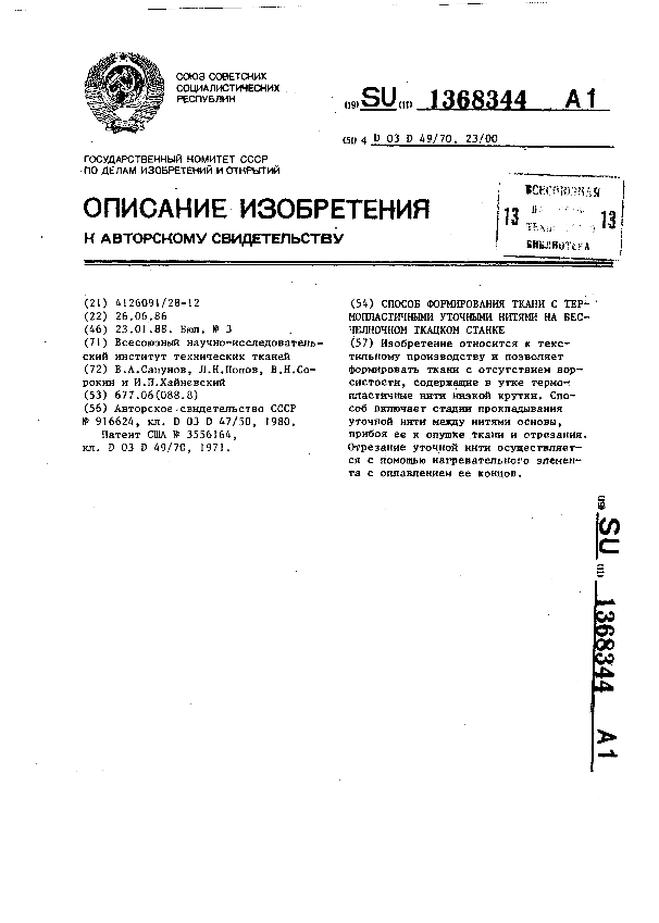 Способ формирования ткани с термопластичными уточными нитями на бесчелночном ткацком станке / Сапунов В. А., Попов Л. Н., Сорокин В. Н., Хайневский И. П.; заявитель: Всесоюзный научно-исследовательский институт технических тканей // Описания изобретений (ретрофонд) / Комитет по патентам и товарным знакам России. — М., 1994-____. — (Патенты России). – 1988, № 1. — Загл. с титул. экрана. — Поисковая система: ИПС MIMOSA GTI. — Систем. требования: Acrobat Reader. — Режим доступа: ftp://smolensklib.ru/bd/patent_ru/pt1368344.pdf. — <URL:ftp://smolensklib.ru/bd/patent_ru/pt1368344.pdf>.