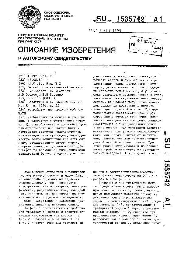 Устройство для трафаретной печати / Бобров В. И., Солонец И. П., Орехов А. В., Тарасов В. Н.; заявитель: Омский политехнический институт // Описания изобретений (ретрофонд) / Комитет по патентам и товарным знакам России. – М., 2003. – 1990, № 1. — (Патенты России). — Загл. с титул. экрана. — Поисковая система: MIMOSA GTI. — Систем. требования: Acrobat Reader. — Режим доступа: ftp://smolensklib.ru/bd/patent_ru/pt1535742.pdf. — <URL:ftp://smolensklib.ru/bd/patent_ru/pt1535742.pdf>.