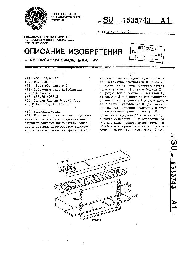 Скоросшиватель / Кузьмичев В. И., Слепцов А. В., Алексеев Е. В. // Описания изобретений (ретрофонд) / Комитет по патентам и товарным знакам России. – М., 2003. – 1990, № 1. — (Патенты России). — Загл. с титул. экрана. — Поисковая система: MIMOSA GTI. — Систем. требования: Acrobat Reader. — Режим доступа: ftp://smolensklib.ru/bd/patent_ru/pt1535743.pdf. — <URL:ftp://smolensklib.ru/bd/patent_ru/pt1535743.pdf>.