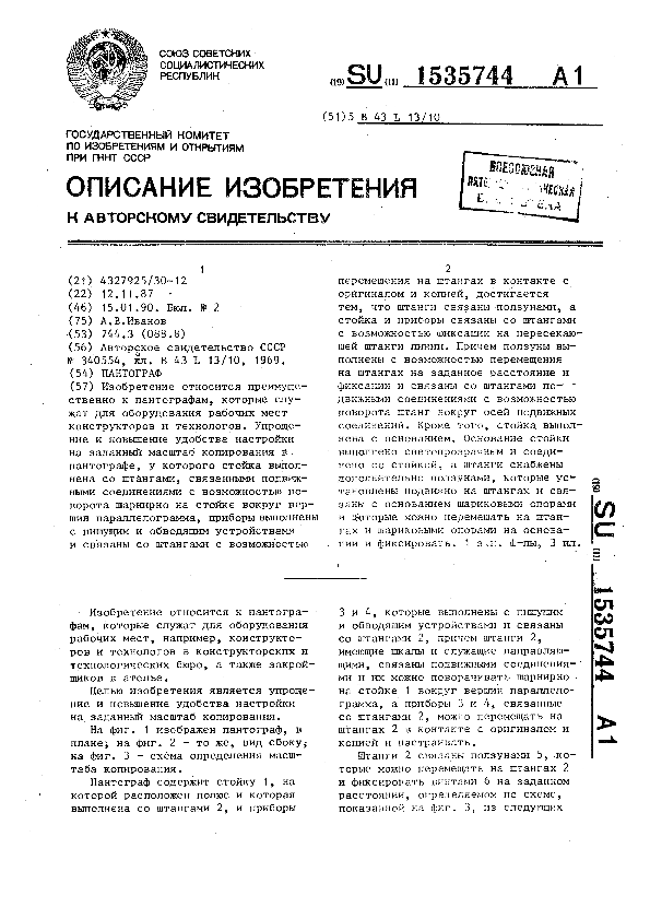 Пантограф / Иванов А. В. // Описания изобретений (ретрофонд) / Комитет по патентам и товарным знакам России. – М., 2003. – 1990, № 1. — (Патенты России). — Загл. с титул. экрана. — Поисковая система: MIMOSA GTI. — Систем. требования: Acrobat Reader. — Режим доступа: ftp://smolensklib.ru/bd/patent_ru/pt1535744.pdf. — <URL:ftp://smolensklib.ru/bd/patent_ru/pt1535744.pdf>.
