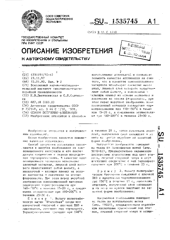 Способ получения аппликации / Дмитриевская И. В., Салтыкова С. Л.; заявитель: Всесоюзный научно-исследовательский институт текстильно-галантерейной промышленности // Описания изобретений (ретрофонд) / Комитет по патентам и товарным знакам России. – М., 2003. – 1990, № 1. — (Патенты России). — Загл. с титул. экрана. — Поисковая система: MIMOSA GTI. — Систем. требования: Acrobat Reader. — Режим доступа: ftp://smolensklib.ru/bd/patent_ru/pt1535745.pdf. — <URL:ftp://smolensklib.ru/bd/patent_ru/pt1535745.pdf>.