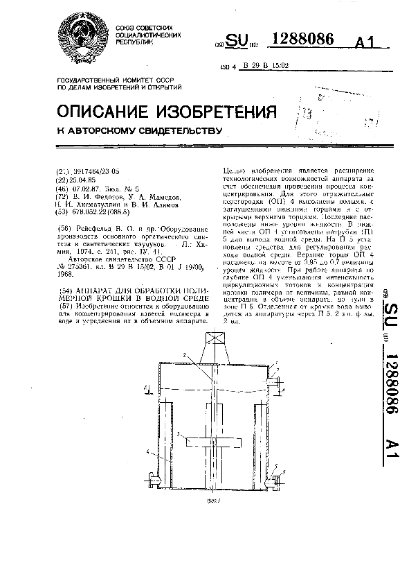 Аппарат для обработки полимерной крошки в водной среде / Федотов В. И., Мамедов У. А., Хисматуллин Н. И., Алимов В. И. // Описания изобретений (ретрофонд) / Комитет по патентам и товарным знакам России. – М., 2003. – 1987, № 1. — (Патенты России). — Загл. с титул. экрана. — Поисковая система: MIMOSA GTI. — Систем. требования: Acrobat Reader. — Режим доступа: ftp://smolensklib.ru/bd/patent_ru/pt1288086.pdf. — <URL:ftp://smolensklib.ru/bd/patent_ru/pt1288086.pdf>.