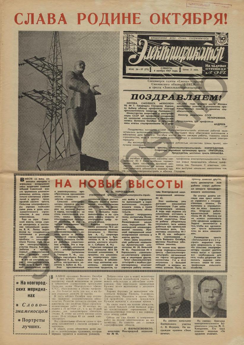 Электрификатор: Спецвыпуск газеты "Смена" - органа Смоленского обкома ВЛКСМ - и треста "Запсельэлектросетьстрой". — Смоленск: Тип. им. Смирнова, 1965-____. № 36-37.