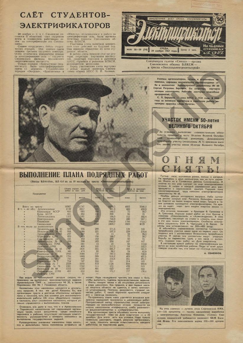 Электрификатор: Спецвыпуск газеты "Смена" - органа Смоленского обкома ВЛКСМ - и треста "Запсельэлектросетьстрой". — Смоленск: Тип. им. Смирнова, 1965-____. № 38-39.
