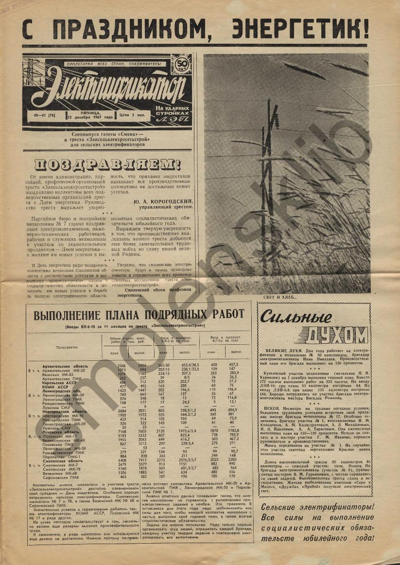 Электрификатор: Спецвыпуск газеты "Смена" - органа Смоленского обкома ВЛКСМ - и треста "Запсельэлектросетьстрой". — Смоленск: Тип. им. Смирнова, 1965-____. № 40-41.