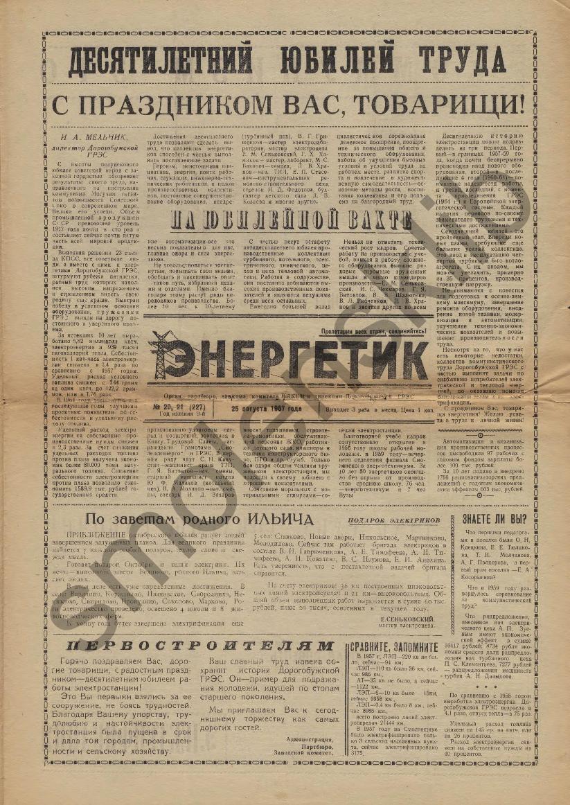 Энергетик: Орган партбюро, завкома, комитета ВЛКСМ и дирекции Дорогобужской ГРЭС. — Сафоново: Сафоновская тип., 1958-____. № 27.