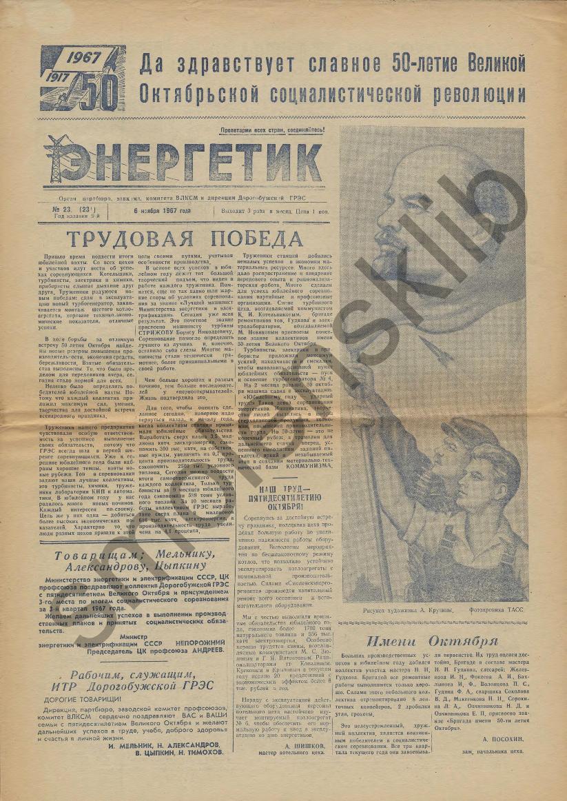 Энергетик: Орган партбюро, завкома, комитета ВЛКСМ и дирекции Дорогобужской ГРЭС. — Сафоново: Сафоновская тип., 1958-____. № 23.