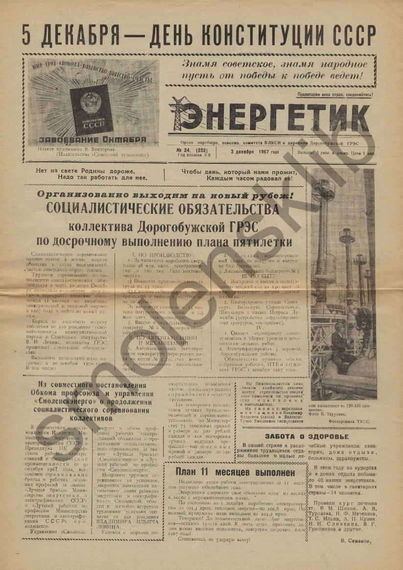 Энергетик: Орган партбюро, завкома, комитета ВЛКСМ и дирекции Дорогобужской ГРЭС. — Сафоново: Сафоновская тип., 1958-____. № 24.