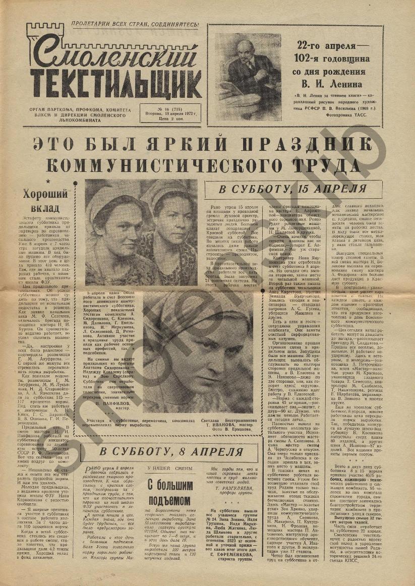 Смоленский текстильщик: Орган парткома, профкома, комитета ВЛКСМ и дирекции Смоленского льнокомбината. — Смоленск: Смолгортип., 1957-____. № 16.